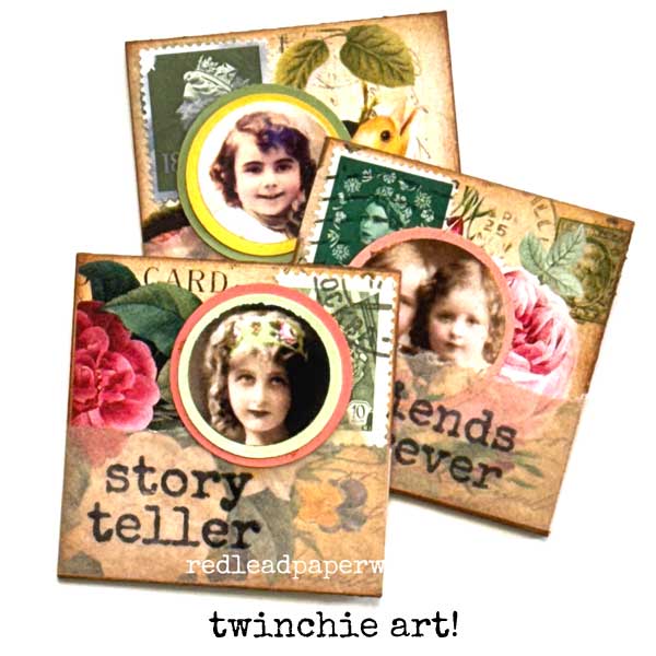 There are 3 different Artist Trading Cards, 6 Twinchies, and 12 Inchies on the Vintage Elements 616 Collage Sheet. The size of the Artist Trading cards are 2-1/2" x 3-1/2", Twinchies are 2" x 2", Inchies are 1" x 1".